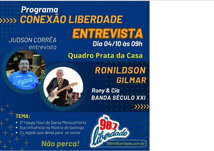 No próximo sábado, 04 de outubro, o programa Conexão Liberdade traz uma entrevista especial no quadro Prata da Casa. O apresentador Judson Corrêa recebe o músico Ronildson Gilmar, integrante da banda Século XXI e do projeto Rony & Cia.