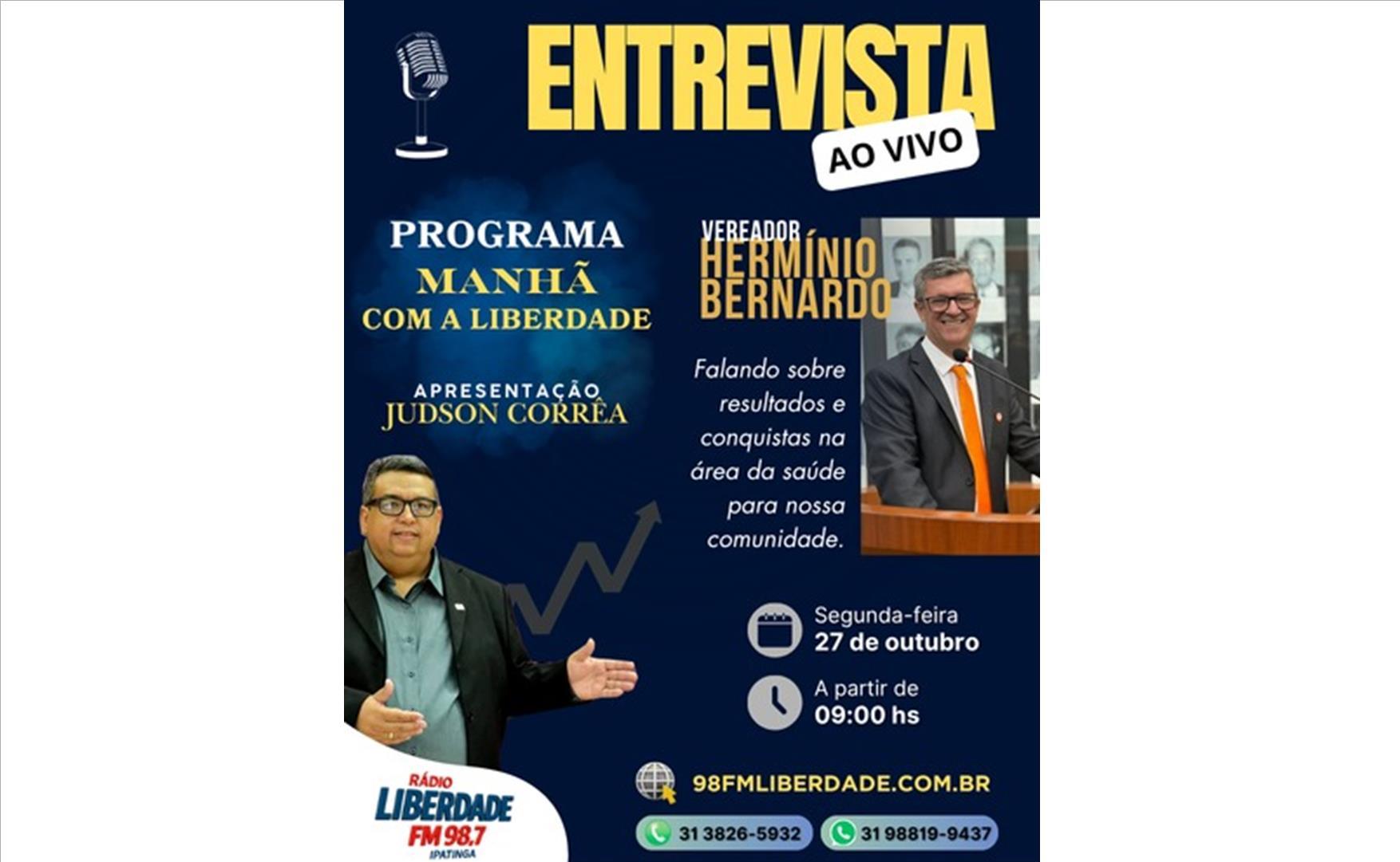 Nesta segunda-feira, 27 de outubro, às 9h da manhã, o vereador Hermínio Bernardo será o entrevistado do programa “Manhã com a Liberdade”, na Rádio Liberdade FM 98,7, com apresentação de Judson Corrêa.
